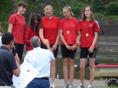 Sieben Landestitel von Rheinland-Pfalz, zwei Silber- und drei Bronzemedaillen errang die gemeinsame Rudergruppe der RG Treis-Karden und des Kurfürst-Balduin-Gymnasiums Münstermaifeld. 17 Schulen stellten dieses Jahr ihre Mannschaften um den Landesentscheid im Rudern im Wettbewerb „Jugend trainiert für Olympia“ auszutragen, der gemeinsam von der Rudergesellschaft Treis-Karden und dem Kurfürst-Balduin-Gymnasium Münstermaifeld ausgerichtet wurde. Insgesamt waren über die Wettkampfdistanz von 1000 Meter 19 Landestitel zu vergeben, davon acht mit der Qualifikation zum Bundesfinale in Berlin. Mit 10 Medaillen war die einheimische Flotte wieder klar vorne. Gleich vier Boote qualifizierten sich zum Bundesfinale in Berlin, darunter auch der Achter als Flagschiff. Insgesamt errangen 54 Schüler von Mosel und Maifeld eine der begehrten Medaillen, davon 39 die Goldene. Das Johannes-Gymnasium Lahnstein belegte mit vier Siege und mit weiteren vier Silbermedaillen in der Gesamtwertung den zweiten Platz. Zu jeweils zwei Siegen kamen das Gymnasium am Römerkastell und das Gymnasium an der Stadtmauer aus Bad Kreuznach, wobei das erstgenannte sich mit dem Gig-Vierer der Jungen (Wettkampklasse II) nach Berlin qualifizierte. Jeweils einen Sieg mit der Fahrkarte zum Bundesfinale in Berlin errang die Realschule Cochem, das Gymnasium am Kaiserdom Speyer und das Sebastian Münster-Gymnasium Ingelheim. Der umfangreiche Helfer- und Regattastab aus Schule und Verein funktionierte wieder einwandfrei. Mit der Wasserschutzpolizei Cochem und den freiwilligen Feuerwehren aus Moselkern und Müden auf der Regattastrecke hielten diese die Fäden wieder fest in den Händen. Für eine ausreichende Verpflegung war wie immer gesorgt. Eine Siegerehrung, die vom Vertreter des Ministeriums Michael Stäudt moderiert wurde, mit Vertretern aus Schule, Politik und Rudern brachte die Veranstaltung zu einem gelungenen Abschluss. Gesponsert wurde die Siegerehrung durch Sachpreise der Firma Hieronimi aus Faid. |