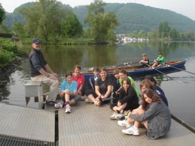 Zur Mannschaftsbildung hatte die Kooperation der Rudergesellschaft Treis-Karden und des Kurfürst- Balduin Gymnasiums Münstermaifeld und zu einem Ruderlager ins Bootshaus eingeladen. Sportlehrer Franz Esser (l.) leitete diesen dreitägigen Lehrgang, zu dem die jüngeren Rudertalente, die sich auf der Rudersichtung hervorgehoben haben, eingeladen waren. Die neu gebildeten Mannschaften können nun gezielt ihr Training im Rahmen der Ruder AG und des Trainings der Rudergesellschaft aufnehmen um beim Landesentscheid der Schulen im Wettbewerb „Jugend trainiert für Olympia“ am 14. Juni in Treis-Karden an den Start zu gehen. |