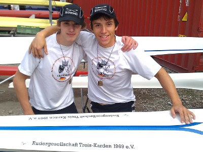 Die Treis-Kardener Kinder- und Juniorenruderer starteten nur drei Tage nach dem Trainingslager in Saarburg in Mannheim in die neue Regattasaison und konnten dabei fünf Siege errudern. Erfolgreichster Ruderer war dabei Alexander Diedrich, der dreimal am Siegersteg anlegen durfte. Der Schüler des Kurfürst-Balduin Gymnasiums Münstermaifeld konnte an beiden Regattatagen seine Einerrennen in der Leichtgewichtsklasse der U 17 überzeugend gewinnen und musste dazu noch nicht einmal sein volles Leistungsvermögen abrufen. Seinen dritten Sieg errang er zusammen mit Moriche Schlebusch im Doppelzweier der Altersklasse U 19. Nach einem hart umkämpften Rennen durfte auch Moriche Schlebusch im Einer am Siegersteg anlegen. Samstags musste er aufgrund von Taktischen Fehlern noch seinen Gegnern den Vortritt lassen. Den letzten Sieg an diesem Wochenende ging an die Zweierkombination Jonas Belda und Paul Becker. Die beiden 15-jährigen konnten am Sonntag den Doppelzweier der U 17 gewinnen, nachdem das Rennen am Samstag wegen eines Gewitters ausgefallen war. Weitere gute Platzierungen belegten die Kinderruderer. Jonathan Müller und Lennard Belda belegten bei den Langstreckenrennen am Samstag einen vierten und dritten Platz. Zusammen mit Florian Stein konnte Jonathan Müller am Sonntag über die 1000 Meter Strecke im Doppelzweier noch einen guten zweiten Platz verbuchen. Auch Lennard Belda konnte seine gute Leistung über die Kurzstrecke am Sonntag bestätigen. |