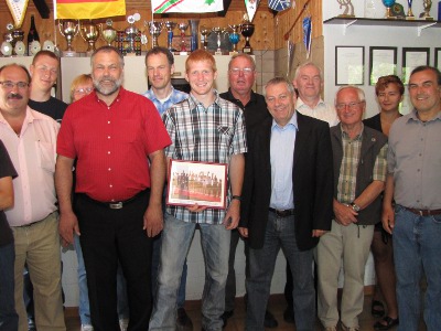 Die "Ruderfamilie" hatte sich im Bootshaus versammelt um ihren Deutschen Meister Lukas Oberhausen offiziell zu empfangen. Der 1. Vorsitzender der Rudergesellschaft, Peter Löhr, begrüßte die Mitglieder und Gäste, zu denen auch Landrat Manfred Schnur, Verbandsbürgermeister Manfred Führ und für die Ortsgemeinde, der erste Beigeordnete Tino Knaup gehörte. Die anschließenden Gratulationsworte drückten zusammen den Stolz auf den Aktiven und seinen Verein aus. Mit dem Titel des Deutschen Meisters im Leichtgewichts Achter fügte das Rudertalent aus Treis-Karden seiner Sammlung einen weiteren nationalen Titel hinzu. Bei einer Bilderpräsentation des Meisterschaftsrennens konnten sich die anwesenden Gratulanten ein Bild des Erfolges machen. |