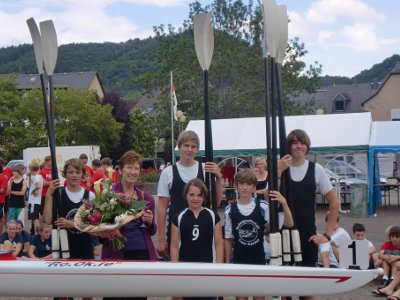 Drei Landestitel von Rheinland-Pfalz, sowie zwei Silbermedaillen gingen an die gemeinsame Rudergruppe des Kurfürst-Balduin Gymnasiums Münstermaifeld und der RG Treis-Karden. 21 Schulen aus Rheinland-Pfalz mit über 70 Booten, sowie 8 Boote aus dem Saarland, waren nach Treis-Karden gekommen, um den Landesentscheid im Rudern im Wettbewerb der Schulen "Jugend trainiert für Olympia" auszutragen, der gemeinsam von der Rudergesellschaft Treis-Karden und dem Kurfürst-Balduin Gymnasium Münstermaifeld ausgerichtet wurde. Insgesamt waren auf der Wettkampfdistanz von 1000 Metern 19 Landestitel im Zweier bis zum Achter zu vergeben, davon acht mit der Qualifikation zum Bundesfinale in Berlin. Mit drei Siegen, und zwei Silbermedaillen war die einheimische Flotte wieder knapp vorn und zwei Vierermannschaften qualifizierten sich zum Bundesfinale in Berlin. Bemerkenswert auch die Erfolgsausbeute des Nikolaus-von-Weis Gymnasiums Speyer, welches ebenfalls drei Titel gewann und ein Boot nach Berlin qualifizierte. Die beiden Achterkonkurrenzen gingen an das Gymnasium am Römerkastel Bad Kreuznach, der jüngere Achter (WKII) löste dabei die Fahrkarte nach Berlin. Zwei Siege errang auch das Johannes Gymnasium Lahnstein und kann sich über die Qualifikation des Mädchen-Vierers im jüngsten Teilnehmerjahrgang (WKIII) freuen. Die beiden Goldmedaillen in den Zweierkonkurrenzen gingen klar an das Friedrich-Wilhelm Gymnasium Trier. Drei weitere Schulen trugen sich in die Siegerliste ein und qualifizierten ihre Mannschaft zum Bundesfinale in Berlin, das Eleonore Gymnasium Worms, das Stefan-Georg Gymnasium Bingen und die Maria-Ward Schule Mainz. Die Hildegardis Schule Bingen und das Gymnasium an der Stadtmauer Bad Kreuznach kamen je zu einem Vierer-Landessieg. Michael Stäudt vom Ministerium für Bildung, Wissenschaft, Jugend und Kultur zeigte sich sehr zufrieden mit dem umfangreichen Helfer und Regattastab aus Schule und Verein, mit Willi Rüdel, Franz Esser und Michael Hippert an der Spitze, die wieder eine gelungene Veranstaltung präsentieren konnten. Peter Wich-Glasen und Dirk Bogdanski, mit den freiwilligen Feuerwehren aus Moselkern und Müden sorgten routiniert auf dem Wasser für Ordnung und die Sicherheit. Hanne Krahnke organisierte die Verpflegung für Regattahelfer und die 400 Teilnehmern und Dr. Kastor war, wie schon in den Jahren zuvor, als Regattaarzt vor Ort. Eine Siegerehrung, die vom Vertreter des Ministeriums Michael Stäudt moderiert wurde, mit Schulleiterin Madeleine Dazert-Balthasar, Hans-Jürgen Sehn, 1. Beigeordneter des Landkreises Cochem-Zell, dem 1. Beigeordneten der Verbandsgemeinde Treis-Karden Heinz Kugel, dem Ortsbürgermeister von Treis-Karden Philipp Thönnes, Lutz Itschert (Ruderverband Rheinland), Schul- Elternsprecher Thomas Timm, brachte die Veranstaltung zu einem gelungenen Abschluss. |