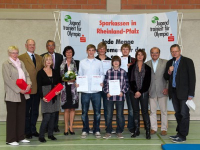 Das Kurfürst-Balduin-Gymnasium Münstermaifeld, Partnerschule des Sports, gehört zu den erfolgreichsten Schulen, die im Rudern in Rheinland-Pfalz aktiv sind. Beim diesjährigen Finale in Berlin errangen die jungen Sportler, die bei der Rudergesellschaft Treis-Karden vorbereitet wurden, Jonas Belda, Paul Simon Becker, Alexander Dietrich, Robin Steiner und Jonas Wiesen, die Bronzemedaille. Staatssekretärin Vera Reiß und Sparkassenverbandsgeschäftsführer Norbert Wahl zeichneten die erfolgreichen Sportler in Schloss Waldthausen bei Mainz aus. Verschiedene Sportdarbietungen und die Weltmeisterin im Kunstradfahren, Sandra Sprinkmaier, sorgten für ein buntes Rahmenprogramm. Durch die Veranstaltung führte der Sportreporter Ulli Potofski. |