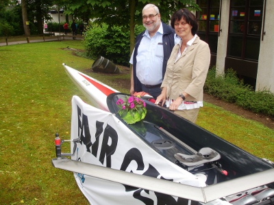 "Beachboy" heißt der Renndoppelzweier, der vom Vorsitzenden des Fördervereins Volker Schütz im Rahmen des diesjährigen Schulfestes in Münstermaifeld getauft wurde. Das Boot wurde im Frühjahr 2010 mit Hilfe des Fördervereins für den Schulrudersport bei der RG Treis-Karden angeschafft und die Taufe war längst überfällig. Den Bootsnamen hatten sich die jugendlichen Ruderer gewünscht und waren bei der Namensenthüllung durch die Schulleiterin Madeleine Dazert-Balthasar sichtlich zufrieden. |