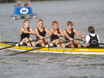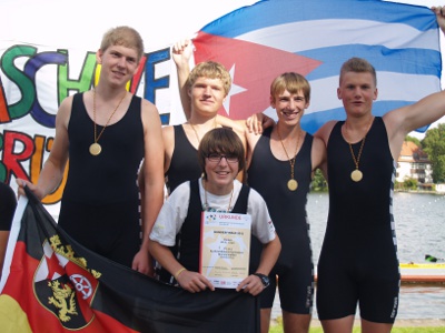 Der Gig-Vierer mit Steuermann des Kurfürst-Balduin Gymnasiums Münstermaifeld, der Partnerschule des Sports, holt die Goldmedaille beim Bundesfinale „Jugend trainiert für Olympia“ in Berlin in Rekordzeit. Die neue Bundessiegermannschaft mit Schlagmann Alexander Diedrich, Jonas Belda, Paul Becker, Florian Stein und Steuermann Jonas Wiesen siegte auf der Olympiastrecke von 1936 in Berlin Grünau in neuer Bestzeit dieser Bootsgattung mit 3:24,95 min, dahinter die Angelaschule Osnabrück (3:25,96 min) vor der Schillerschule Frankfurt (3:30,63 min). Langfristig zusammengestellt und vorbereitet wurde die Mannschaft in Kooperation mit der Rudergesellschaft Treis-Karden vom Trainer- und Betreuerteam mit Dagmar Hippert, Elke Stenzel, Dominik Keller, Franz Esser und Michael Hippert. Der Doppelvierer mit Steuermann (U15) musste wegen Erkrankung des Schlagmanns Lennard Belda mit nur drei Ruderern an den Start gehen. Dieser „Doppeldreier mit Steuermann“ mit Philipp Groiss, Jonas Weber, Tim Bier und Steuermann Lorenz Schneider, schnitt dabei mit dem 11. Platz beachtlich ab. Mit mehr als 500 Schülerinnen und Schülern fand das Bundesfinale "Jugend trainiert für Olympia" in Berlin Grünau statt. Vom 23. - 26. September ruderten die deutschen Schulen die Meister aus, auch in diesem Jahr gab es wieder sehr gute Leistungen zu bewundern. Insgesamt lässt sich ein eindeutiger Trend zu den Ruder Schwerpunktschulen erkennen, die immer erfolgreicher diese Wettkämpfe bestreiten. Die Kooperation des Kurfürst-Balduin Gymnasiums Münstermaifeld mit der Rudergesellschaft Treis-Karden ist die erfolgreichste von Rheinland-Pfalz. Ihr Bundessieg ist in diesem Jahr die einzige Goldmedaille der Rheinland-Pfälzischen Mannschaften beim Herbstfinale „Jugend trainiert für Olympia“. |