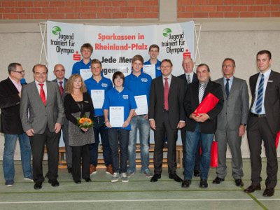 Die Bundessieger im Gig-Vierer mit Steuermann Alexander Diedrich, Paul Becker, Jonas Wiesen, Jonas Belda und Florian Stein wurden im Schloss Waldthausen bei Mainz von Vertretern des Kultusministeriums, des Landessportbundes und des Sparkassenverbandes ausgezeichnet. Sportreporter Ulli Potofski, der durch die Ehrungen der rheinland-pfälzischen Medaillengewinner in den Schulwettbewerben führte, hob in seiner Laudatio die besondere Leistung des Vierers hervor. Der Vierer musste um zu siegen die schnellste je gefahrene Zeit in dieser Bootsklasse des 40-jährigen "Jugend trainiert für Olympia"-Wettbewerbs fahren. Das Kurfürst-Balduin Gymnasium Münstermaifeld, Partnerschule des Sports, gehört zu den erfolgreichsten Schulen, die im Rudern in Rheinland-Pfalz aktiv sind. Durch die Kooperation wurde die erfolgreiche Mannschaft bei der Rudergesellschaft Treis-Karden langfristig vorbereitet und setzt sich auch aus den erfolgreichen Kaderruderer der Rudergesellschaft zusammen. |