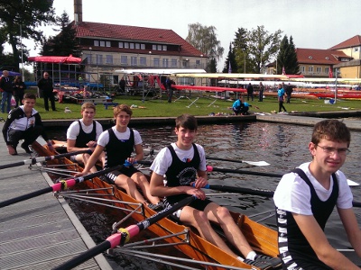 Der Jungen Doppelvierer mit Steuermann U18 (Wettkampfklasse II) des Kurfürst-Balduin Gymnasiums Münstermaifeld, der Partnerschule des Sports, vorbereitet von der RG Treis-Karden, scheiterte im Hoffnungslauf knapp am A Finale und erruderte sich mit dem zweiten Platz im B Finale den offiziellen 8. Platz. Als Landessieger von Rheinland-Pfalz hatte sich die Mannschaft mit Schlagmann Tim Bier, Jonas Weber, Florian Stein und Jonathan Müller nach Berlin qualifiziert und zeigte mit dem dritten Platz im Vorlauf und der gleichen Platzierung im Hoffnungslauf ansprechende Leistungen. Zuletzt fehlten weniger als eine Sekunde auf der 1000 Meter Olympiastrecke von 1936 in Berlin Grünau zum Einzug in das A Finale. Im B Finale kam der in der Kooperation mit der RG Treis-Karden von Dominik Keller betreute Vierer knapp hinter dem Boot aus Ratzeburg auf den zweiten Rang. |