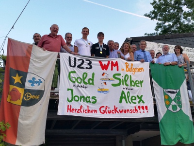 Applaus für U23 Weltmeister Jonas Wiesen und Vizeweltmeister Alexander Diedrich im voll besetzten "Hermann Schmitz" Bootshaus in Treis-Karden. Dieser kam von den zahlreichen Gratulanten, die den Goldmedaillengewinner im Achter und den Vizeweltmeister im Leichtgewichtsvierer beglückwünschten. Eingeladen hatte die Rudergesellschaft Treis-Karden mit der Ortsgemeinde Brieden und zahlreiche Ehrengäste aus Politik und Sport, Sponsoren, Mäzenen, Bürger aus Brieden sowie Mitglieder der Rudergesellschaft waren der Einladung gefolgt und RG Sportvorsitzender Michael Hippert, sowie Erwin Thönnes, Bürgermeister aus Brieden moderierten den Empfang. Staatssekretärin des Ministeriums des Innern, Sport und Infrastruktur Heike Raab überbrachte die Glückwünsche der Ministerpräsidentin Malu Dreyer, lobte die leistungssportliche Kontinuität der Rudergesellschaft und betonte, dass nicht nur Treis-Karden stolz über die Erfolge von Jonas Wiesen und Alexander Diedrich sein könne, sondern auch die Region und sogar Rheinland-Pfalz. Landrat Manfred Schnur, die Verbandsbürgermeister Helmut Probst und Albert Jung, Jürgen Claßen 1.Beigeordneter Treis-Karden, Sportkreis Vorsitzender Edwin Scheid und Lutz Itschert, 1. Vorsitzender des Ruderverband Rheinland überbrachten Glückwünsche, Wertschätzungen und Ehrengaben für die Sportler und den Verein. Zugleich fanden sie anerkennende Worte für die Unterstützung und Förderung durch die Familien der beiden Spitzensportler und für die Arbeit des Trainerteams der Rudergesellschaft. In einem Rückblick erinnerte Hippert an den ersten Sieg des Vereins durch Hans Senger und die erste WM Medaille (Bronze) durch Cornelia Cichy, jetzt Nitzsche. Bei Fotos und Filmen auf einer Großleinwand berichteten Wiesen und Diedrich über das WM Renngeschehen, die Renntaktiken und die zweimonatige, harte Zeit im WM Vorbereitungstrainingslager. Ein Team aus "Jung und Alt" hatte für "Leib und Seele" Vorsorge getroffen, sodass noch lange im Bootshaus über "alte Zeiten", die jüngsten Erfolge und die Zukunft diskutiert werden konnte. |