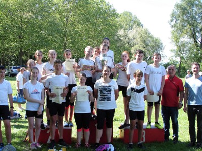 Platz 1 in der Gesamtwertung belegte der gemeinsame Rudernachwuchs (U15) der RG Treis-Karden und des Kurfürst-Balduin Gymnasiums Münstermaifeld bei der Talentregatta in Wiesbaden. Die 17 jungen Ruderinnen und Ruderer der Partnerschule des Sports, starteten in vier Vierermannschaften, zwei davon in der Anfängerklasse und zwei bei den Fortgeschrittenen. Alle Mannschaften konnten sich durch überzeugende Vorlaufsiege in die Endläufe qualifizieren und auch hier jeweils den ersten Platz erringen. In Konkurrenz der 12 Schulen aus Hessen und Rheinland-Pfalz, kam das Kurfürst-Balduin Gymnasium Münstermaifeld auf den ersten Platz und die betreuenden Lehrer Timo Sesterhenn und Michael Hippert konnten den begehrten Wanderpokal aus den Händen von Regattaleiter Ansgar Berz in Empfang nehmen. |
