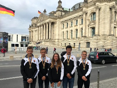 Die Bronzemedaille für das Kurfürst-Balduin Gymnasium Münstermaifeld, dem Ruderkooperationspartner der Rudergesellschaft Treis-Karden, gewannen Schlagmann Simon Haible, Julian Harwardt, Steffen Theisen, Leon Spies und Steuerfrau Julia Bischof im Gig Doppelvierer mit Steuermann der Wettkampfklasse II. Die Qualifikation für das Bundesfinale in Berlin erfolgte mit einem sicheren ersten Platz beim Landesentscheid der Schulen von Rheinland-Pfalz. Und die Mannschaft von Mosel und Maifeld konnte auch auf den 1000 Meter der Olympia Regattastrecke in Berlin Grünau überzeugen. Mit einem zweiten Platz im Vorlauf, hinter dem späteren Bundessieger vom Wilhelm Gymnasium Hamburg, zogen sie ins A Finale ein und kamen nach einem spannenden Rennverlauf mit einem starken Endspurt auf den 3. Platz. Die Silbermedaille gewann knapp davor das Gymnasium Carolinum Osnabrück, die „Holzmedaille“ gewann wiederum knapp dahinter die Mannschaft der Goetheschule Wetzlar. „Jugend trainiert für Olympia“ wird jährlich unter der Schirmherrschaft des amtierenden Bundespräsidenten ausgetragen und ist mit ca. 800.000 Teilnehmerinnen und Teilnehmern der weltgrößte Schulsportwettbewerb. Jeweils die Landessieger der 16 Bundesländer sind startberechtigt. Der ehemalige Bundessieger und Abiturient des „Kuba“ Gymnasiums, der Partnerschule des Sports, Florian Stein hatte die Betreuung in Berlin übernommen. |
