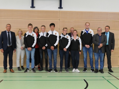 In den Räumen der Unfallkasse Rheinland-Pfalz in Andernach und unterstützt durch den Sparkassenverband und dem Landessportbund Rheinland-Pfalz, wurden acht Rheinland-Pfälzische Schulen für ihre besonderen Erfolge von Bildungs Staatssekretär Hans Beckmann ausgezeichnet. Darunter die Doppelvierer Mannschaft des „KuBa“ Gymnasiums Münstermaifeld mit Schlagmann Simon Haible, Julian Harwardt, Steffen Theisen, Leon Spies und Steuerfrau Julia Bischof, die beim Herbstfinale „Jugend trainiert für Olympia“ in Berlin die Bronzemedaille gewonnen hatte. Sein Dank für die Leistungen galt nicht nur der Mannschaft, sondern auch den betreuenden Lehrkräften, den Eltern, Trainerinnen und Trainern der Rudergesellschaft Treis-Karden und allen anderen Beteiligten. Neben dem sportlichen Erfolg hob Beckmann das Erlernen von Werten wie Fairness, Teamgeist und Einsatzfreude hervor. |
