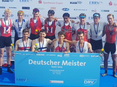 Simon Haible von der Rudergesellschaft Treis-Karden gewinnt im DRV Auswahlboot die Goldmedaille bei der Deutschen Meisterschaften U23 im Leichtgewichts Doppelvierer. Der Bundestrainer hat aufgrund der Saisonergebnisse bei zwei Ranglistenregatten diese Mannschaft zusammengesetzt. Mit im Boot Oskar Kroglowski (Kiel), Linus David (Neuwied) und Emil Hennies (Berlin). Bis zur Streckenhälfte kann die Renngemeinschaft Mainz, Saarbrücken, Stuttgart dem hohen Tempo des Bootes mit Simon Haible folgen, muss dann aber abreißen lassen.