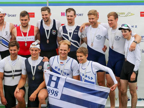 Bronze im Männer Vierer mit Stm. Bfür Steuermann Jonas Wiesen (1. v. r.) Foto: Seyb/Derlien, DRV, www.rudern.de