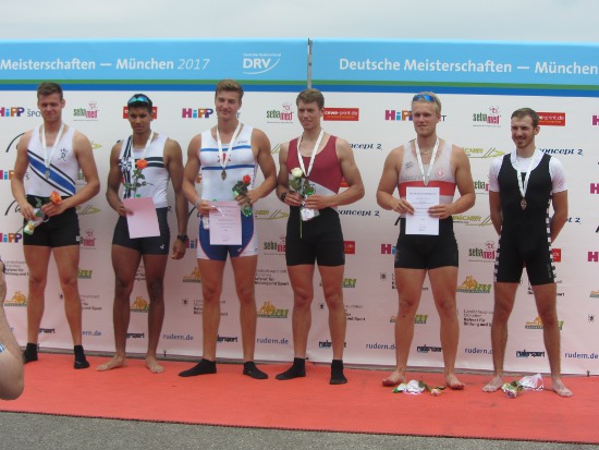 Bronze im Männer Zweier ohne Stm. Bfür Alexander Diedrich (1. v. r.)