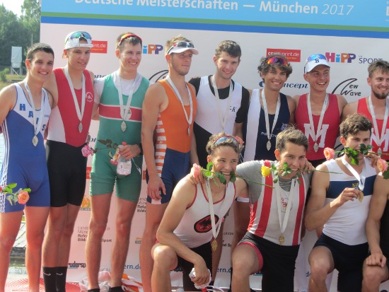 Silber im Leichtgewichts Männer Achter Bfür Tim Bier (oben 4. v. r.)