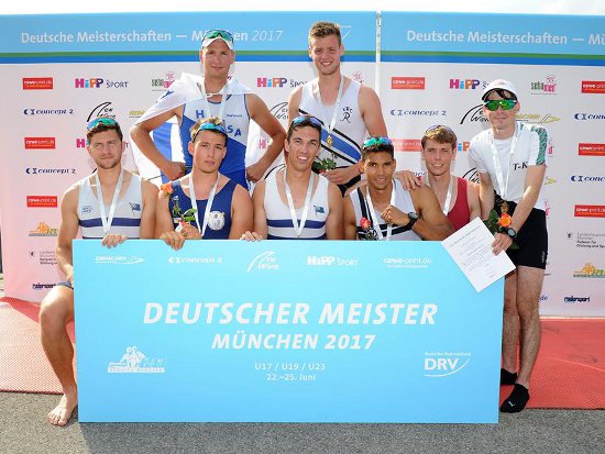 Gold im Männer Achter Bfür Steuermann Jonas Wiesen (1. v. r.)Seyb, www.rudern.de