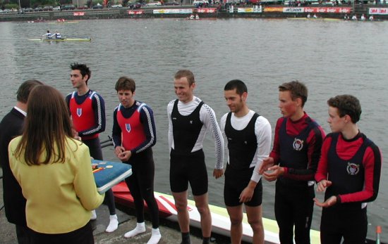 Gold im Leichtgewichts Männer Zweier ohne Stm.für Ralf Balthasar und Jost Schömann-Finck (3. und 4. v. Rechts)