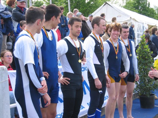 Gold im Leichtgewichts Männer Zweier ohne Stm.für Ralf Balthasar und Jost Schömann-Finck (3. und 4. v. Links)